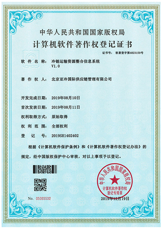 冷鏈運(yùn)輸資源整合信息系統(tǒng)軟件著作權(quán)登記證書(shū)