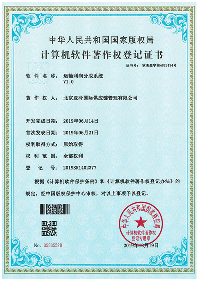運(yùn)輸利潤(rùn)分成系統(tǒng)軟件著作權(quán)登記證書(shū)