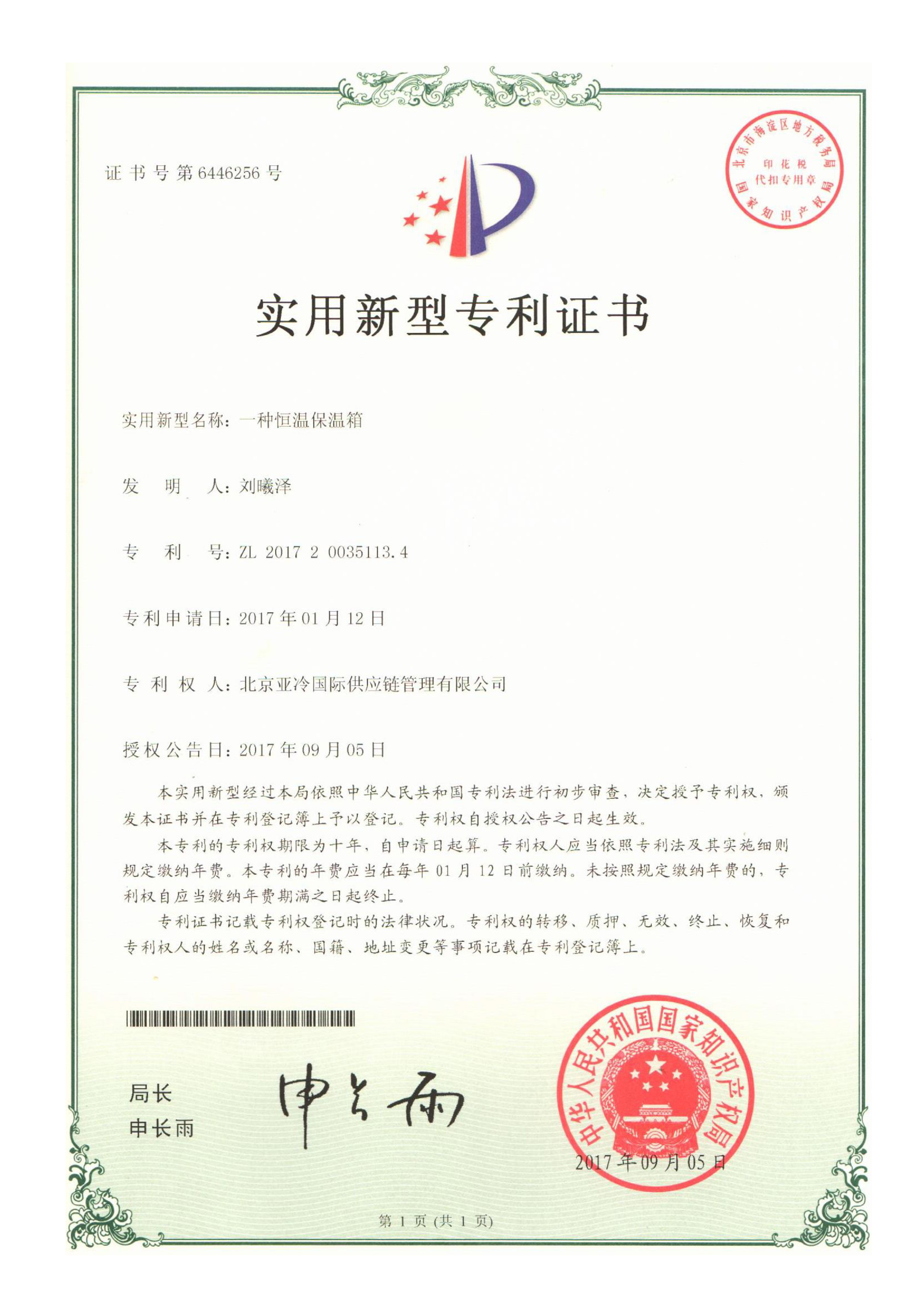實(shí)用新型專利證書(shū) 恒溫保溫箱