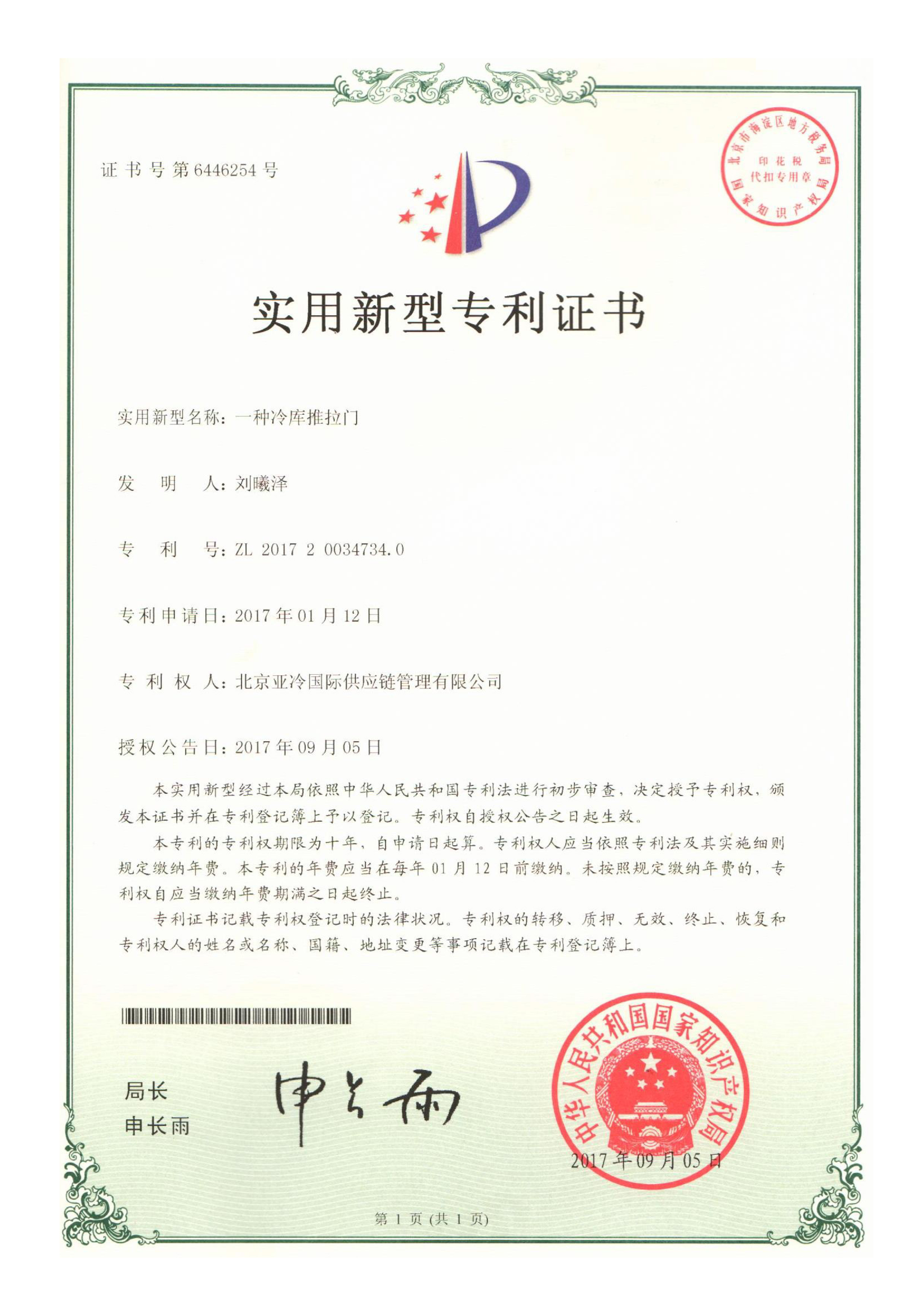 實(shí)用新型專利證書(shū) 冷庫(kù)推拉門(mén)