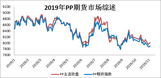 ????????2019年P(guān)P期貨價(jià)格全年呈現(xiàn)震蕩下跌走勢。其中3月中旬到4月中旬、6月初到7月初、8月底到9月中旬有階段性反彈,在每次價(jià)格反彈后仍是繼續(xù)下行探底??v觀全年價(jià)格走勢,按照PP主力收盤價(jià)格看,3月4日8936元/噸創(chuàng)年內(nèi)最高點(diǎn);截止目前,8月29日創(chuàng)年內(nèi)最低點(diǎn)7787元/噸。年內(nèi)高低點(diǎn)價(jià)差1149元,振幅12.9%,按照最高價(jià)格和最低價(jià)格計(jì)算,最大振幅13.7%。