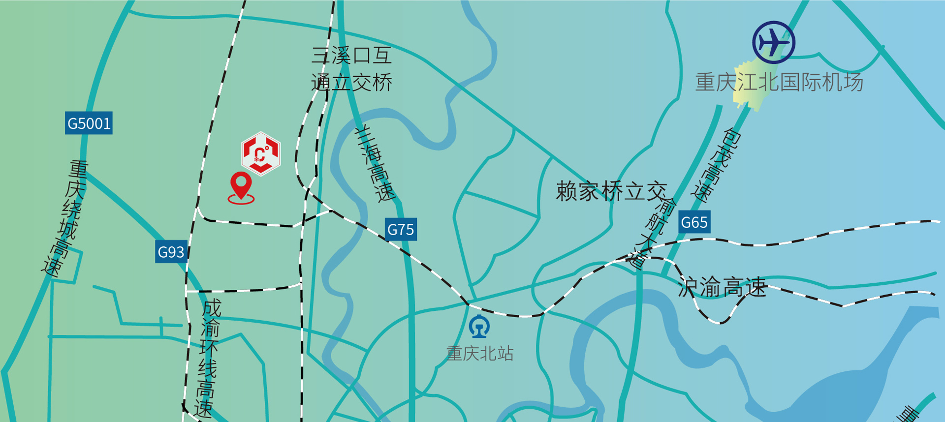 交通優(yōu)勢——距成渝高速3KM,至團結村鐵路集裝箱站2KM,距重慶市區(qū)15KM,處于交通樞紐位置便于周轉配送